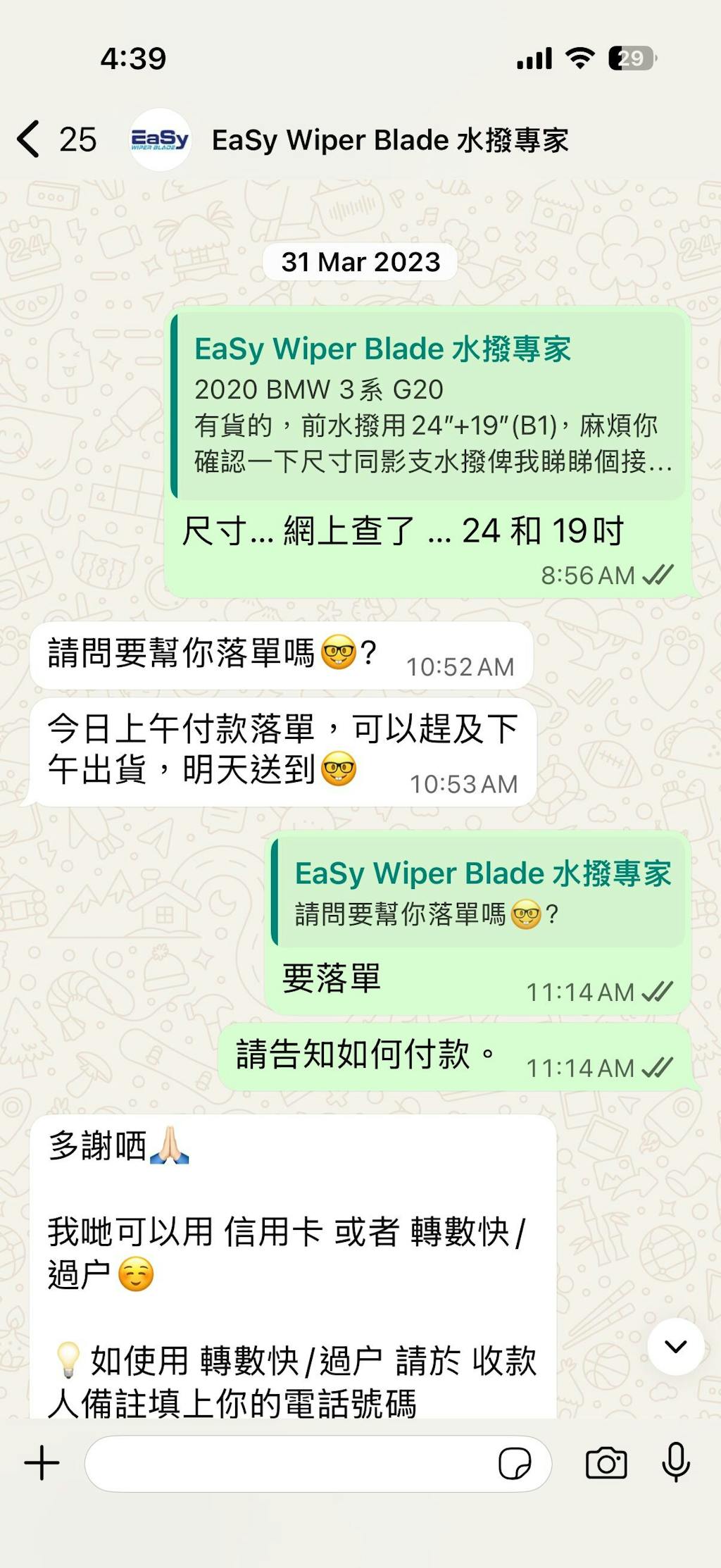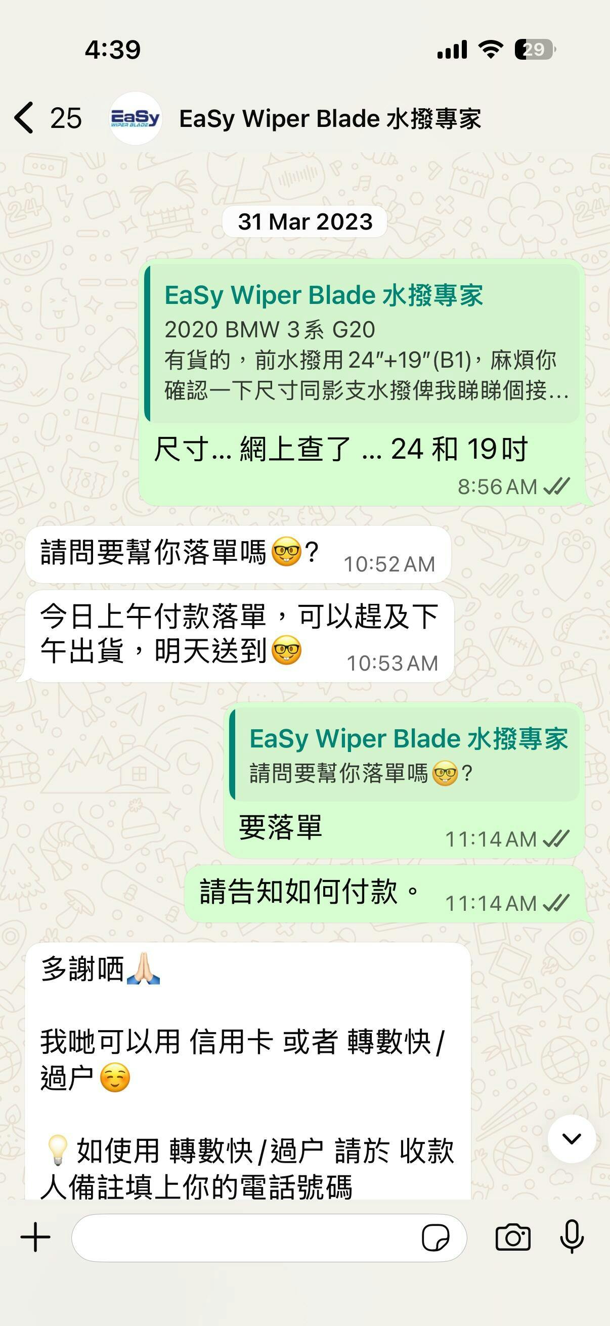 水撥條作為一架車的消耗品,我唔期望用太耐。舊年底發現水撥撥唔乾淨,都覺得時時候要更換。 我睇返WhatsApp 上次的Order,原來是23年3月份。這套Easy Wiper水撥條能用2年半~~~我覺得差不多。 新一套水撥條繼續幫襯Easy Wiper。一換完,洗大銀幕,一撥 ~~~既安靜又乾淨,滿意!